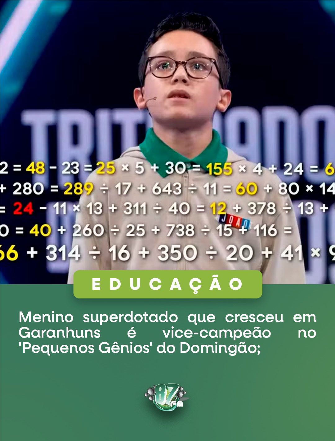 O pequeno gênio João Gabriel Severien, de apenas 11 anos e QI 142, que cresceu em Garanhuns, brilhou no quadro Pequenos Gênios do Domingão com Huck e conquistou o vice-campeonato ao lado da equipe “Iluminados”. 👏🧠 Com talento de sobra em lógica, cálculo e memória, João mostrou inteligência, espírito esportivo e encantou o Brasil inteiro! 🌍💡 🔹 De Garanhuns para o mundo: um exemplo de dedicação e inspiração para todos nós!