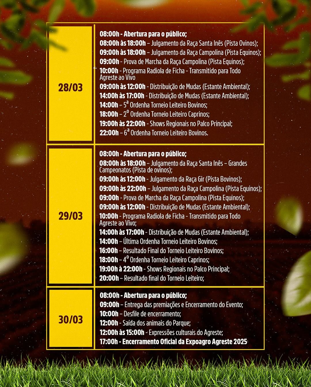 🌱 Julgamento de raças | 🥛 Torneio leiteiro | 🎤 Palestras técnicas | 🎶 Shows regionais | 🌿 Distribuição de mudas